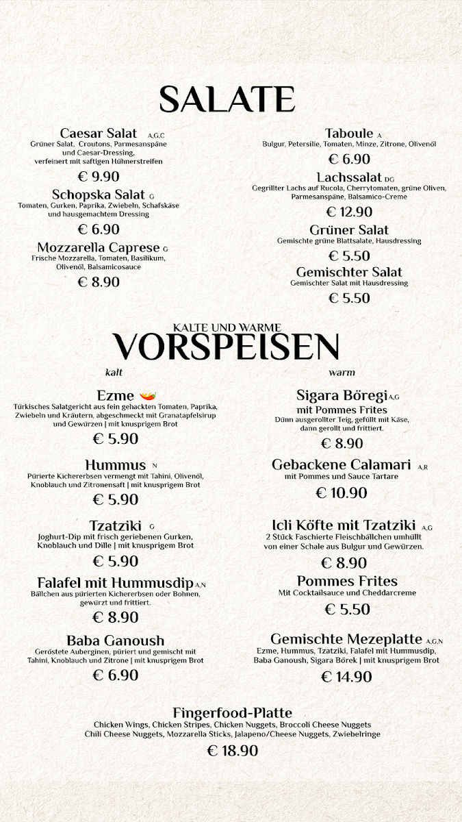 For appetizers (Kalte & Warme Vorspeisen), there are cold options like Tzatziki, Baba Ganoush, and Ezme, perfect for sharing. For a warm start, the Gemischte Mezeplatte and Pommes Frites are tasty and satisfying choices.
