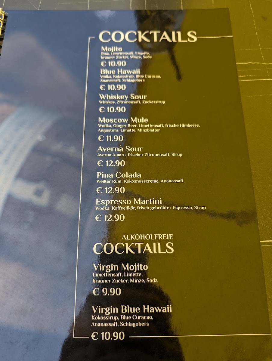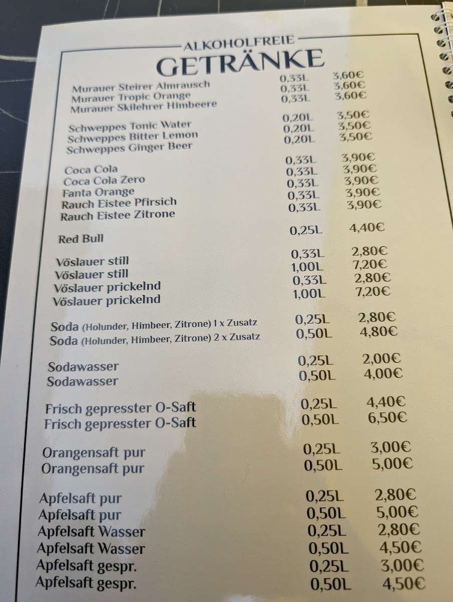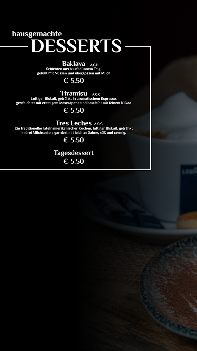 For dessert, Absolut Restaurant & Bar offers tempting Hausgemachte Desserts like the rich Tiramisu, sweet and flaky Baklava, and the creamy Tres Leches, all of which provide the perfect end to your meal.