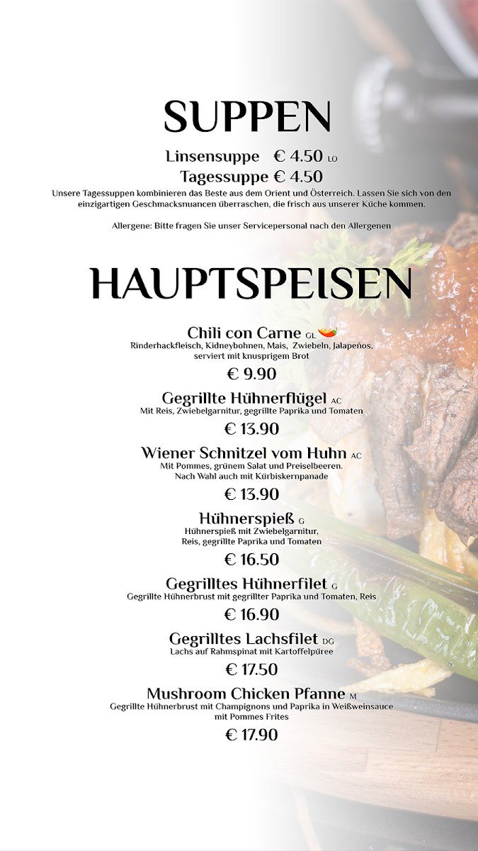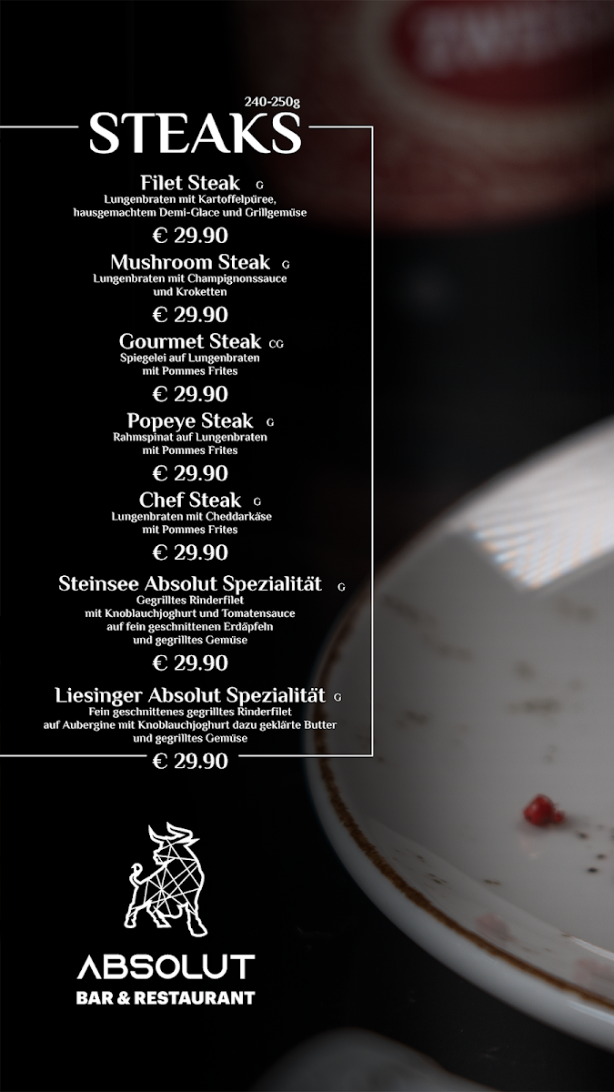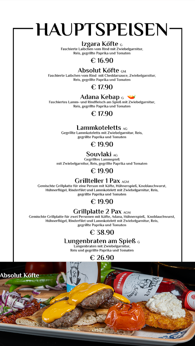 Absolut Restaurant & Bar offers a diverse and appetizing menu that caters to various tastes and preferences, ensuring there's something for everyone. For the main dishes (Hauptspeisen), you can enjoy classic choices such as Gegrilltes Lachsfilet and the iconic Wiener Schnitzel Vom Huhn, along with hearty options like Mushroom Chicken Pfanne and the house specialty Absolut Köfte. For those seeking more grilled options, the Izgara Köfte is a popular choice, offering a savory, well-seasoned experience.