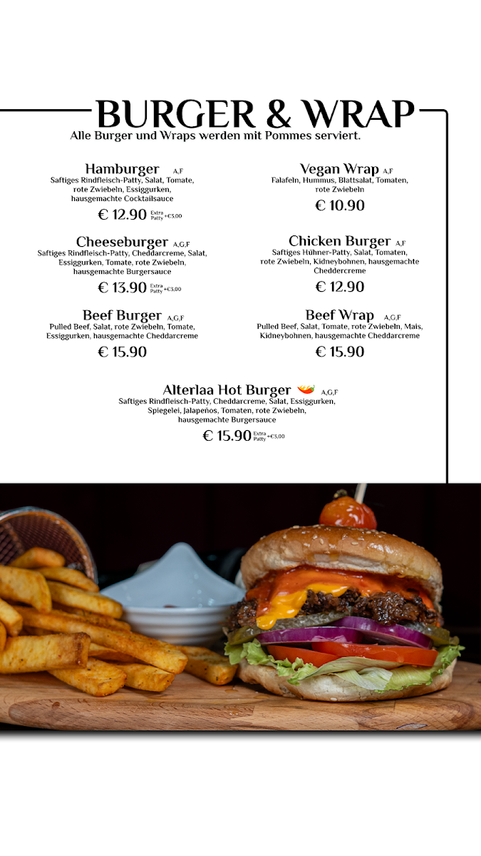 The Burger & Wrap section is filled with flavorful options, including the crispy and satisfying Chicken Burger and Hamburger, as well as the cheesy goodness of the Cheeseburger. For vegan diners, the Vegan Wrap provides a delicious and fresh alternative, while meat lovers can indulge in the juicy Beef Burger.